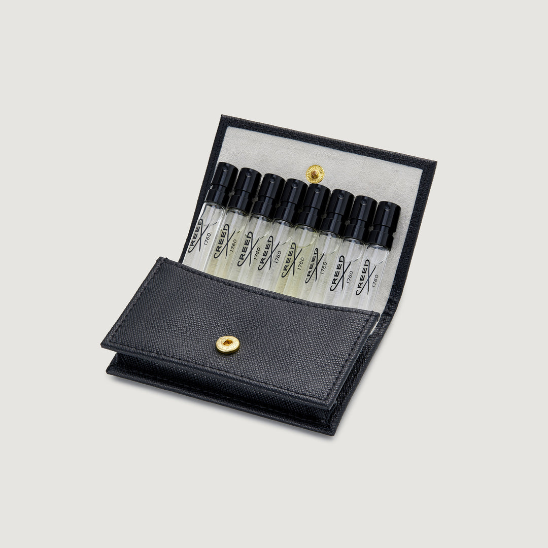 Discover a little luxury with the House of Creed’s Leather Sample Wallet. Crafted out of the finest Italian leather and topped with the House of Creed’s iconic gold logo, this leather wallet is filled with eight sample vials for men. Sleek and streamlined, this Saffiano leather wallet is perfect for carrying your business cards or credit cards, a cherished luxury accessory that you can keep forever with its soft leather outer honoring the brand??s 260-year craftsmanship legacy.