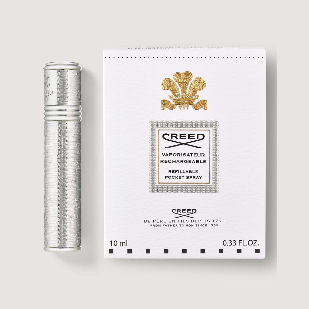 Creed’s atomizers are elegant and traditional in style, this 10ml cylindrical atomizer is finished in silver, encased in embossed silver leather outer. Atomizer comes with a silver funnel to enable easy refilling. Atomizers do not contain fragrance and are designed for use with our flacons.